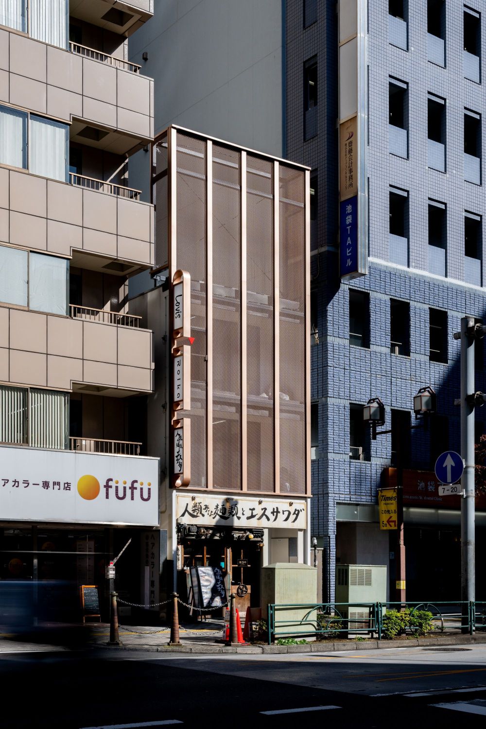 The façade composition was intentionally kept simple in contrast to the cluttered surrounding streetscape, distilled into two primary elements: vertical frames and expanded metal.